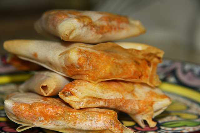 Doblar las hojas de brick por la mitad y cortar, luego doblarlas dejando un rectángulo vertical. Poner una línea de relleno e ir doblandolos formando triángulos. Sellarlo con un poco de clara de huevo.